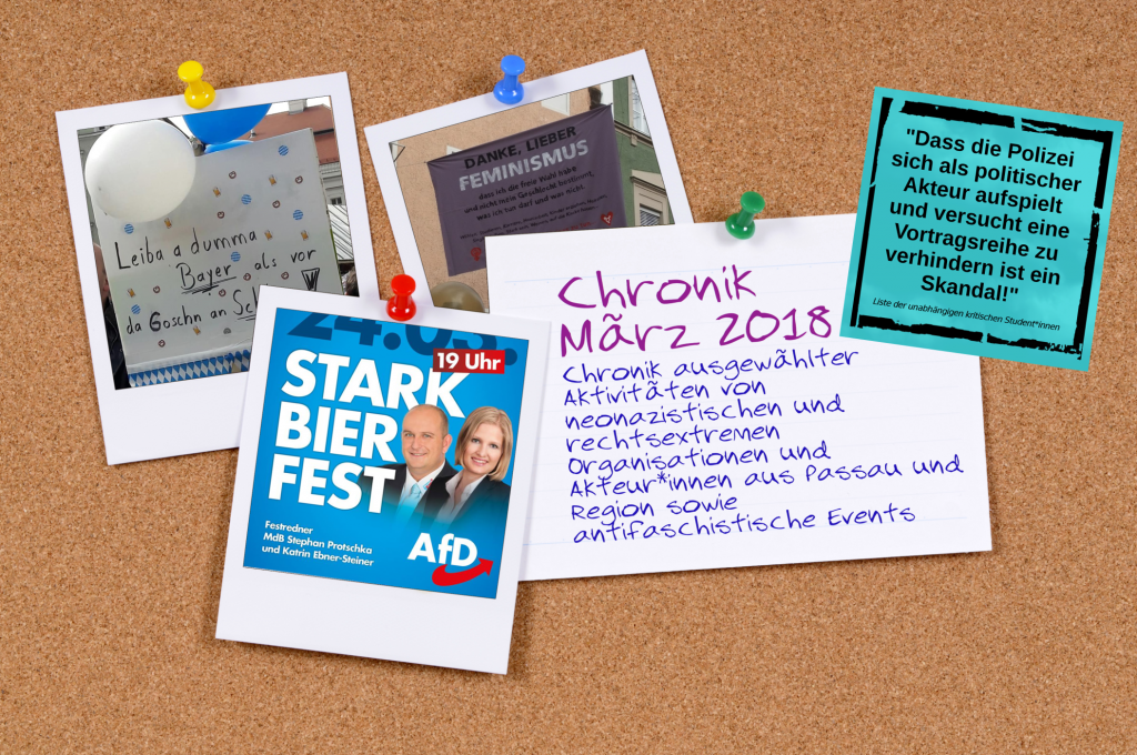 Der März 2018 war geprägt von einer Vielzahl von Aktionen und Auftritten unterschiedlicher Akteur*innen. Der Dritte Weg Ostbayern beschränkte sich primär auf parteiinterne Veranstaltungen wie dem „Heldengedenken“. Die AfD in Niederbayern wählte ihre Kandidat*innen zu den Landtagswahlen, lies sich in Regensburg bei einer Kundgebung gegen den Moscheebau ausbuhen und hatte massive Probleme Räumlichkeiten für ihr im Nachhinein unspektakuläres Starkbierfest (Plattling) zu finden. Die Junge Alternative Ostbayern wirkte durch die Teilnahme an der Kundgebung gegen den Moscheebau und ein paar Selfies bei einer Demo gegen das Polizeiaufgabengesetz (Regensburg) verhältnismäßig aktiv in diesem Monat. In Passau fielen Neonazis des Dynamo-Fanprojekts „Dresden West“ sowie ein Hakenkreuz-Tattoo-Träger durch Gewaltdelikte auf. Ein AfD-Fan verunstaltet zudem seit Monaten die Stadt mit AfD-, „Heil Hitler“ und „Sieg Heil“-Edding-Taggs. Desweiteren erschütterte der Tod eines Geflüchteten, der nur wenige Tage zuvor noch vom Sterbebett aus dem Klinikum Passau abgeschoben hätte werden sollen, die Stadt und entfachte eine neue Debatte über die inhumane Abschiebe- und Asylpolitik.