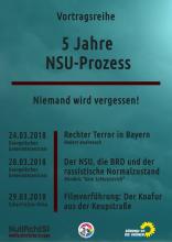 NSU-Vortrag in Passau: Der NSU, die BRD und der rassistische Normalzustand vom Bündnis: Kein Schlussstrich. Trotz weiterer Versuche der Intervention seitens des Staatsschutz fand auch dieser Vortrag vor vollem Vortragssaal und ohne jegliche Schutzmaßnahmen seitens der Polizei statt. Zum Inhalt: „Der NSU, die BRD und der rassistische Normalzustand. Zwischen 1999 bis 2011 beging der NSU drei Bombenanschläge und zehn Morde, darunter neun an migrantischen Kleinunternehmern, sowie zahlreiche Banküberfälle. Erst im Jahr 2011 enttarnte sich die nationalsozialistische Terrorgruppe durch den Selbstmord von Böhnhart und Mundlos selbst. Zwar war der NSU das Werk von militanten Neonazis, ohne die Verwicklungen des Verfassungsschutzes, den Rassismus in Polizei und Gesellschaft hätte es ihn jedoch nie in dieser Form gegeben. Es gilt daher jene Faktoren zu analysieren, die dazu geführt haben, dass der NSU seine neonazistischen Terrorakte begehen konnte. Inwieweit bestehen die gesellschaftlichen Verhältnisse, die den NSU möglich gemacht haben, auch nach dessen Auffliegen fort? Außerdem soll es in dem Vortrag um offene Fragen, den Prozess und die Aktionen am Tag der Urteilsverkündung gehen.“