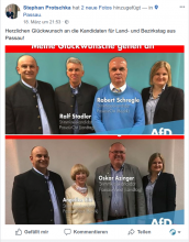 Die AfD Niederbayern verkündet die eben aufgestellten Kandidaten für die Land- und Bezirkstagswahlen aus Passau. Darunter: Der Verschwörungstheoretiker Ralf Stadler (Lieblingsthema: Die antisemitische Theorie der "New World Order") als Landtagskandidat und Robert Schregle als Bezirkstagskandidat (Passau Ost). Für den Stimmkreis Passau West treten für die AfD an: Angelika Eibel als Bezirkstagskandidatin und der ehem. Republikaner und rechtextreme Passauer Stadtrat Oskar Atzinger als Landtagskandidat.