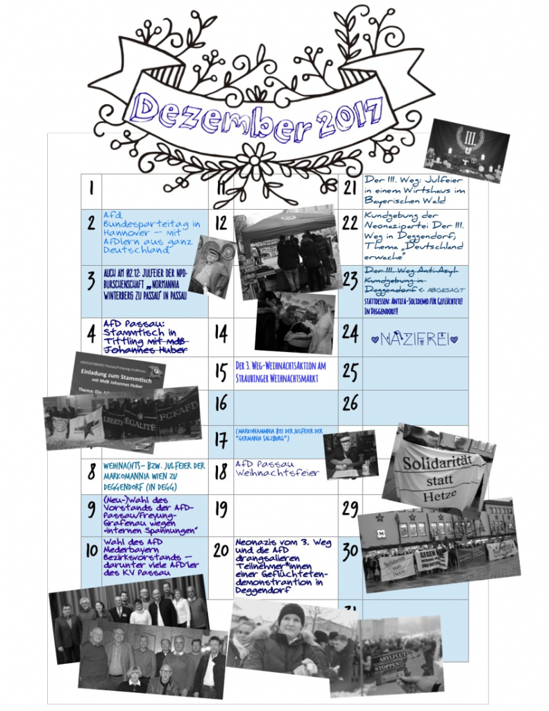 Auch die AfD Passau ließ es sich nicht nehmen das Fest der Nächstenliebe zu nutzen um ihre Politik des Hasses auf Menschen, die mittellos flüchten, in weihnachtlichem Ambiente zu feiern. Aus Angst vor Protesten jedoch lieber im Verborgenen und an geheimem Ort.