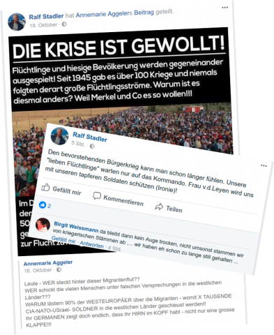 Doch auf Ralf Stadlers Facebookseite finden sich neben blanker Verachtung und Hass gegen jede Art von Geflüchteten (die er selber gerne „Musels“ und „Neger“ nennt) am laufenden Band Hinweise auf seinen Glauben an die jüdische Weltverschwörung, einen bevorstehenden Krieg in Deutschland und die Notwendigkeit sich zu bewaffnen. Am 18. Oktober 2017 teilt er ein Bild mit Geflüchteten mit dem Titel „Die Krise ist gewollt“ und der Bildunterschrift „Leute - WER steckt hinter dieser Migrantenflut?? WER schickt die vielen Menschen unter falschen Versprechungen in die westlichen Länder???“ und die Antwort wird ebenso promt formuliert. Es soll sich um die „CIA-NATO-USrael- SÖLDNER“ handeln, die Geflüchtete „in den Westen einschleusen“.