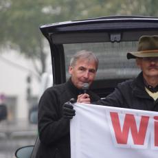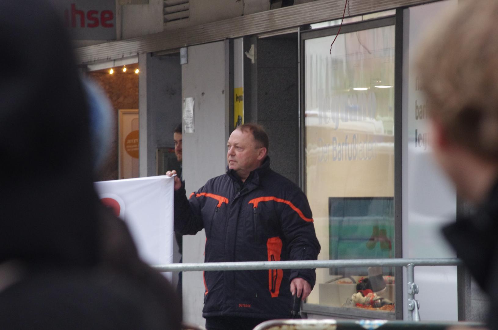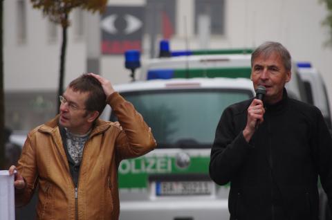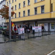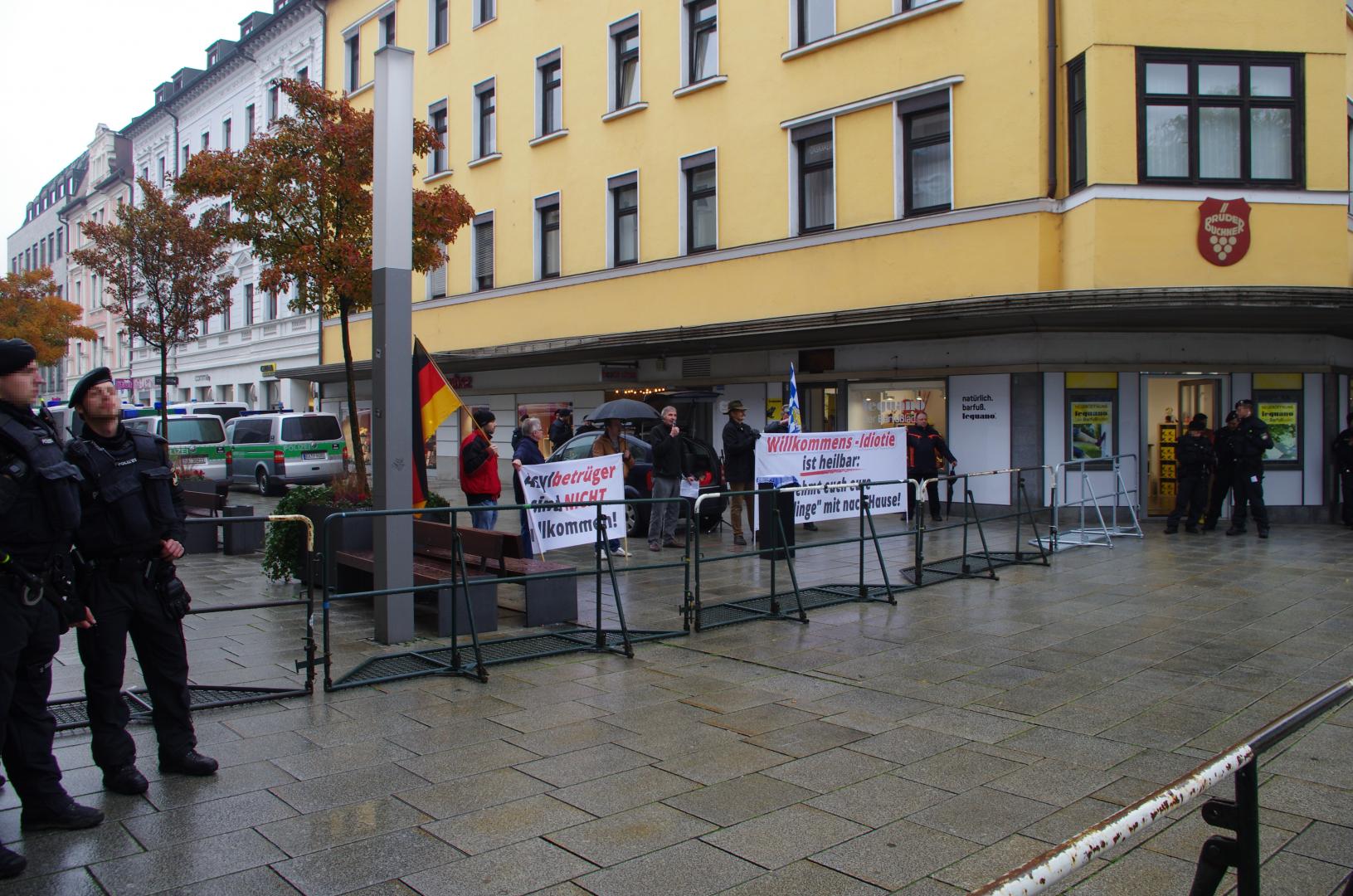 Geredet hat Roland Wuttke – was genau können wir nicht sagen: Bei den vielen Verschwörungstheorien haben die Ohren irgendwann gepfiffen (vielleicht lag das auch an der deutlich besser besuchten Gegenkundgebung). Aber auch Alfred Steinleitner, Vorsitzender der NPD-Niederbayern, war vor Ort und hielt gelangweilt sein Transparent fest.