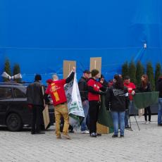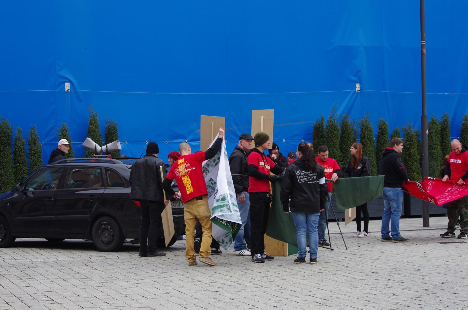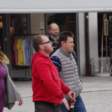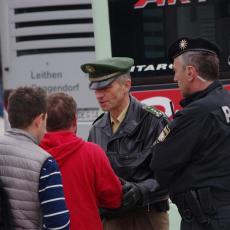 Während die Nazis den Lautsprecherwagen abbauten ging einer der Versammlungsteilnehmer (roter Pullover) auf die Gegenkundgebung bzw. die Polizeireihe davor zu und streckte seinen Arm zum Hitlergruß. Daraufhin wurden seine Personalien von der Polizei aufgenommen und er wurde von zivilen Beamten abgeführt. Während der Versammlung beschäftigte sich der Neonazi bereits eingehend mit einer Flasche Rotwein (siehe Bilder).