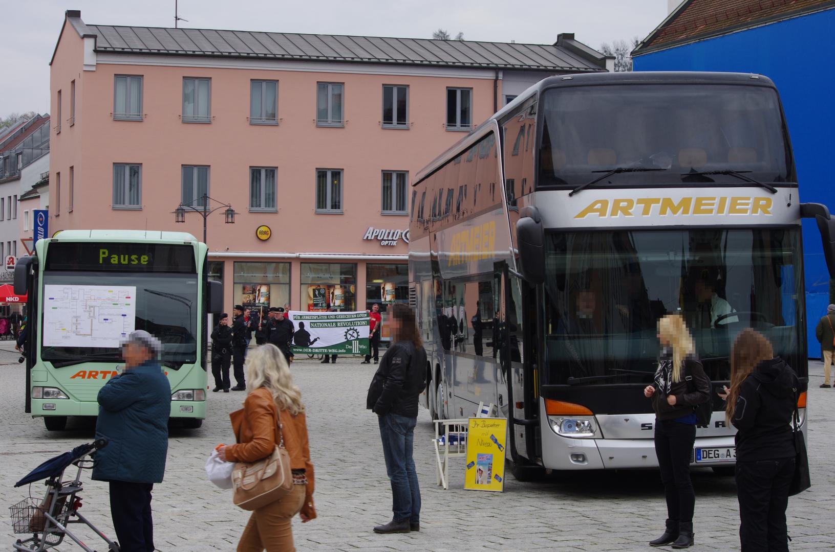 Auf der gegenüberliegenden Seite des Oberen Stadtplatzes versammelten sich gut 150 Deggendorfer*innen und Antifaschist*innen aus dem näheren Umland um gegen die neonazistische Kundgebung zu demonstrieren. Zudem wurde die Sicht auf die Nazi-Kundgebung durch zwei Reisebusse versperrt, die wohl eher zufällig am Stadtplatz standen.
