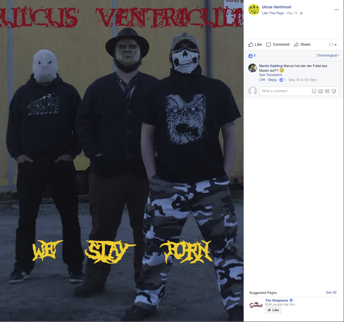 Heute, am 16. Oktober 2017, feiert Ulcus Ventriculi, zu Deutsch „Magengeschwür“, das Release ihres neuen Albums „re*porn“. Die Mitglieder der Band, Mr Peabody, Dr. Tumor und Magic Finger Grannyfuck, sind bzw waren allesamt überzeugte Neonazis und leben in Passau und Umgebung. Ihre eigene Musik beschreiben die Bandmitglieder als „*Porn*Grind*Rock'nRoll*“. Was sich hinter diesem Namen verbirgt sind jedoch lediglich stumpfe Vergewaltigungs- und Gewaltphantasien, gemischt mit schlechter Musik und viel Geschrei.