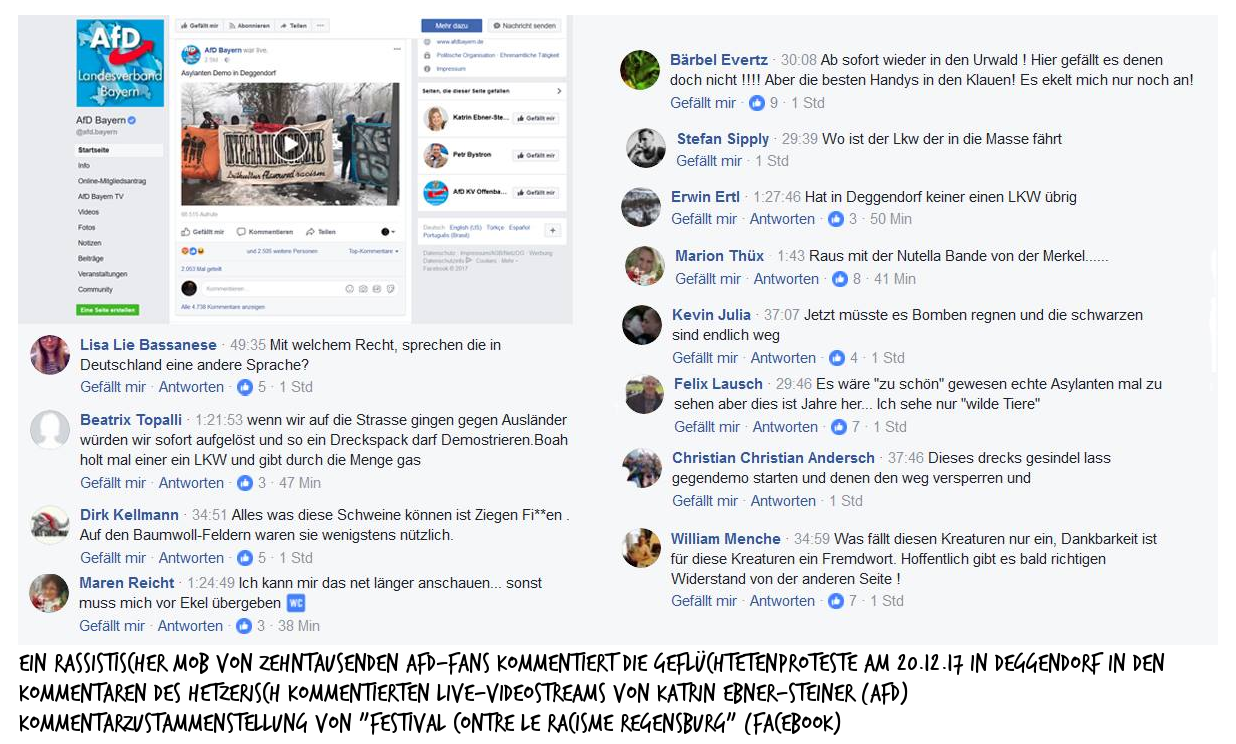 Die Interventionen Katrin Ebner-Steiner der Demo zu verweisen scheiterten am Unwillen der Polizeibeamt*innen einen Platzverweis auszusprechen. So wurde es der Rassistin ermöglicht den Protest weiterhin hämisch kommentierend zu begleiten und den Hass des tobenden Facebookmobs auf die Geflüchteten zu kanalisieren. All diese Vorfälle zeigen erneut eindrücklich, dass in Deggendorf ein beängstigendes rassistisches und menschenfeindliches Klima herrscht und es weiterhin seitens der Stadt Deggendorf kein ernsthaftes Bemühen gibt, den rechten Umtrieben etwas entgegenzusetzen. Durch Behörden und lokalpolitische Akteur*innen werden antirassistische Proteste erschwert oder gar zu verhindern versucht und neonazistische Veranstaltungen hofiert. 1.067 gezählte Angriffe auf Geflüchtete allein bis September des laufenden Jahres 2017 zeigen jedoch, dass das Ignorieren oder gar Begünstigen eines fremdenfeindlichen und rassistischen Klimas für Betroffene schnell zur realen Gefahr werden kann. Wer nun „Das ist doch nur Facebook“ denkt, verharlost das Problem. „In einer Studie unter dem Titel “Fanning the Flames of Hate: Social Media and Hate Crime” der University of Warwick wurde die Verbindung von Hasskommentaren auf der Facebook-Seite der Alternative für Deutschland (AfD) und Übergriffen auf Geflüchtete in Deutschland analysiert.