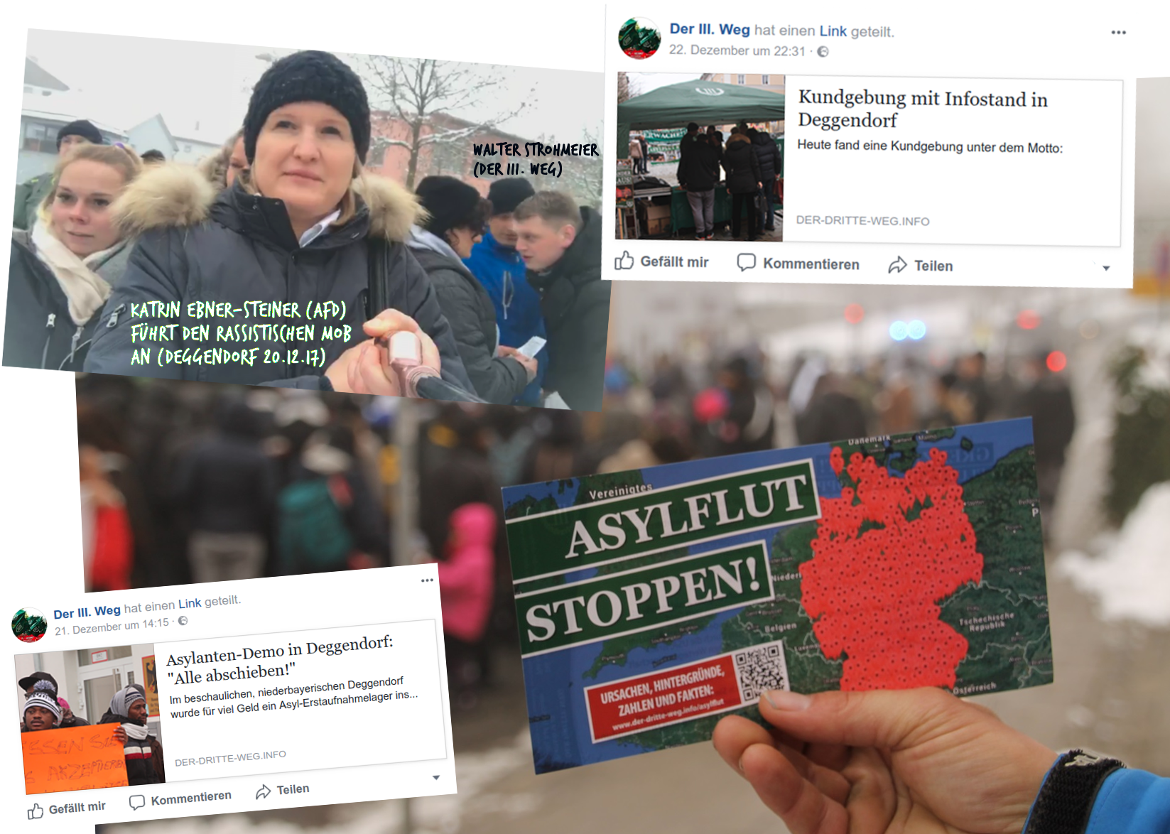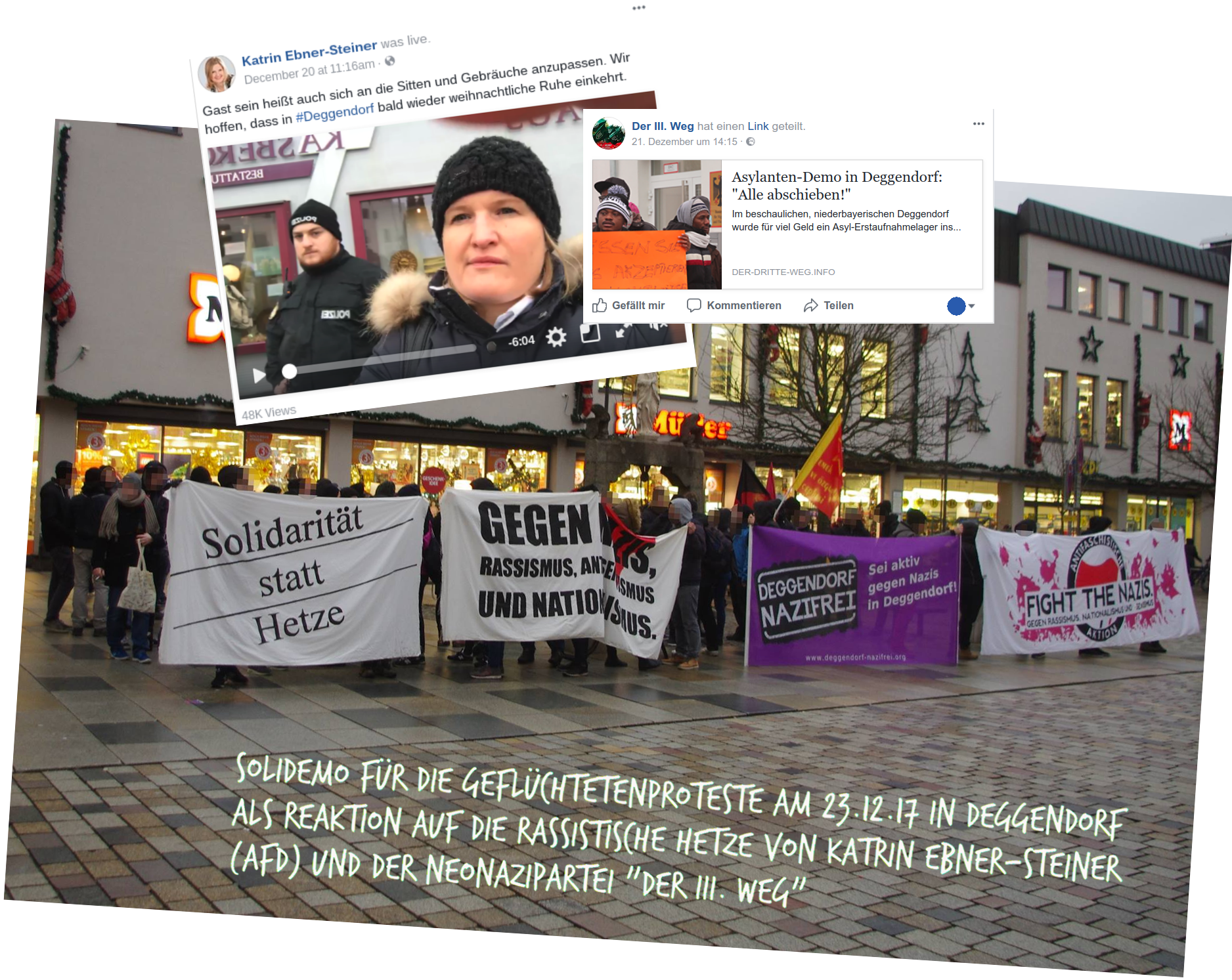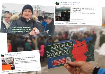 Am 20.12 hatten sich in Deggendorf die Neonazis vom Dritten Weg und die durch rassistische und menschenverachtende Äußerungen bekannte gewordene AfD Vorsitzende, Katrin-Ebner-Steiner unter die ab 10:00 Uhr stattfindene Demonstration der hungerstreikenden Geflüchteten gemischt, die Teilnehmer*innen drangsaliert, abfotografiert und eine Gruppe rassistischer Zuschauer*innen welche die Demo begleitete, immer wieder angeheizt. Die Polizei, Behördenvertreter*innen und Anwohner*innen sahen darin wohl kein Problem. Auf Facebook begleiteten zehntausende Menschen die Video-Liveübertragung Ebner-Steiners von der Demo und bedachten die Szenerie teils mit abwertenden, verachtenden und teils volksverhetzenden Kommentaren.