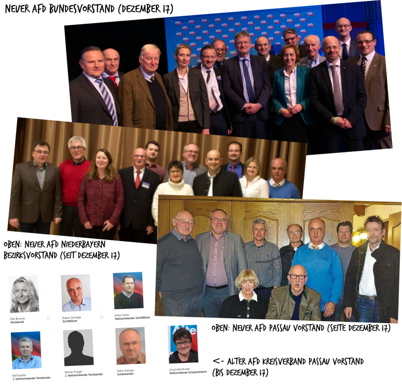 Am 10.12.2017 wurde der neue AfD Vorstand des Bezirks Niederbayern gewählt. Darunter: Oskar Atzinger (AfD Passau), Ursula Bachhuber (ehem. Vorsitzende AfD Passau), Robert Schregle (AfD Passau) und Elke Brunner (ehem Vorsitzende AfD Passau) sowie Paul Kelnhofer und Katrin Ebner-Steiner (beide AFD KV Deggendorf) – Neben dem Vorstand Stephan Protschka (Dingolfing) das who-is-who der lokalen Neuen Rechten. Einen Überblick über den AfD Kreisverband Passau und dessen Akteur*innen und deren Verstrickungen mit dem Parteikreisverband aus Deggendorf haben wir erst vor kurzem unter https://infoticker-passau.org/node/202 publiziert.