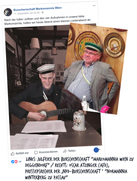 Bereits in den letzten Monaten hatte die rechtsextreme, pflichtschlagende Burschenschaft Markomannia Wien zu Deggendorf verkündet vier neue Interessenten aus Passau in ihren Reihen begrüßt zu haben und daher wieder vermehrt in Passau aktiv sein zu wollen. Bei der diesjährigen Julfeier der Burschen am 08.12 wurden schließlich „vier Einsprünge“ also neue Füxe mit einem herzlichen „Heil Markomannia!“ in der Burschenschaft aufgenommen. Einige Tage später nahmen Burschen der Markomannia an der Julfeier der ebenfalls extrem rechten Burschenschaft Germania Salzburg teil.