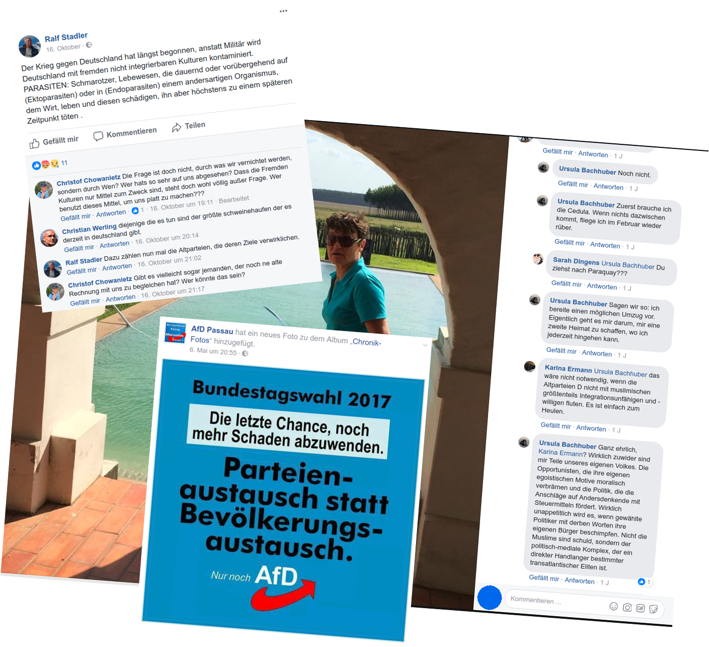 - Zuwanderung und ethnische Minderheiten gelten als Bedrohung der ethnischen Homogenität. Unter anderem gilt die Einwanderung der vergangenen Jahrzehnte und die multikulturelle Gesellschaft als ein von jüdischen Machteliten im Hintergrund gesteuertes Vorhaben zur Schwächung der ethnischen Substanz Deutschlands. Dieser Erklärungsansatz wird vom AfD Kreisverband Passau sowie der ehemaligen Vorsitzenden Ursula Bachhuber (jetzt im Vorstand der AfD Niederbayern) und dem jetzigen Kreisverbandsvorsitzenden Ralf Stadler regelmäßig in der Flüchtlingsdebatte angeführt.