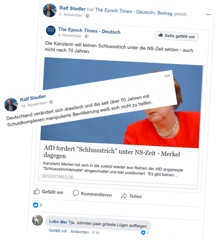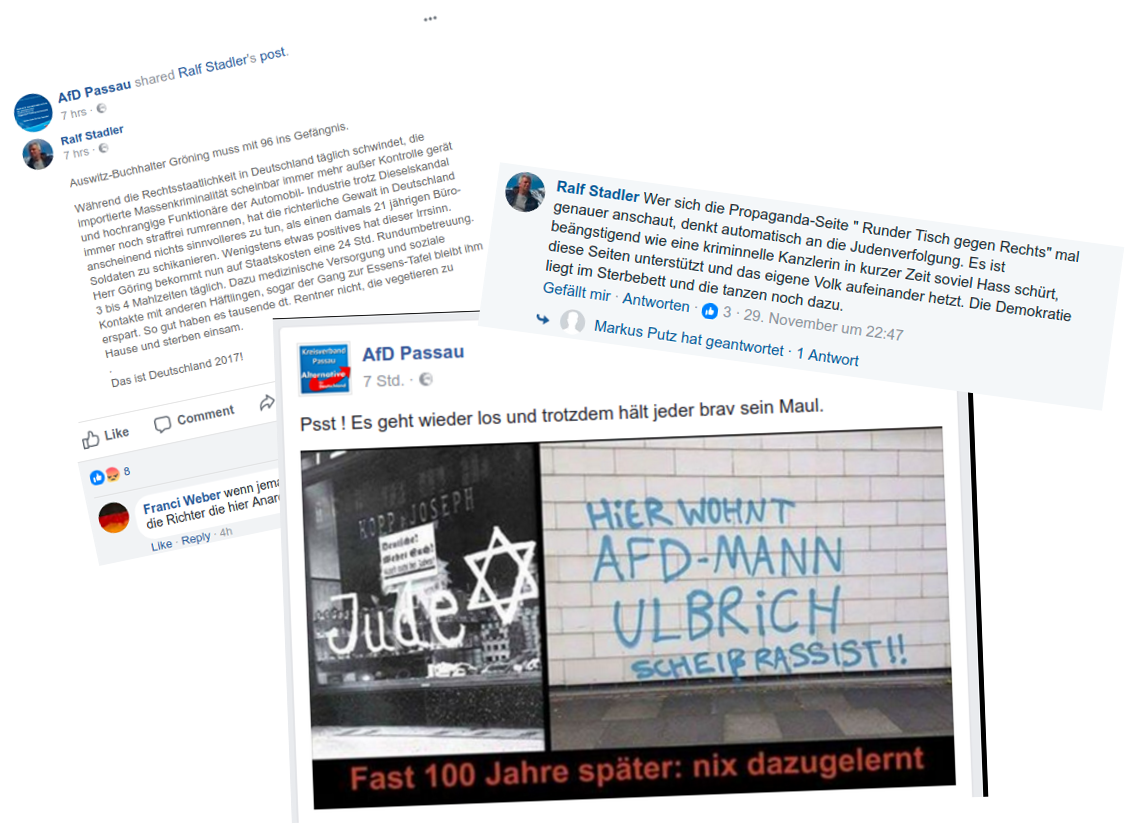 Die aktuelle EU-Politik mit dem Dritten Reich, Angela Merkels Regierung mit der NS-Diktatur und die Konfrontation der AfD mit Gegendemonstrationen, Flyeraktionen oder gar Sprayereien mit der Shoah gleich zu setzen, ist eine Relativierung des Holocausts und Abwertung der Opfer der NS-Zeit. Wenn die Schicksale und das Andenken an verfolgte und ermordete Jüd*innen auch noch von Menschen instrumentalisiert werden, die sonst nicht vor antisemitischer Hetze und Wahnvorstellungen zurückschrecken, ist dies an Dreistigkeit kaum zu überbieten. Zumal ebendiese Menschen ernsthaft verbreiten, dass eine jüdische Weltherrschaftselite das Deutsche Volks mittels Gedankenmanipulation und eines, durch sie eingeschleuste Geflüchtete, ausbrechenden Dschihad aus Rache für den Holocaust auszurotten versucht. Vollends lässt die AfD ihre antisemitische Maske jedoch fallen, als der Vorsitzende Ralf Stadler am 31.12.17 ein Posting für die AfD Passau Facebookseite verfasst, indem er sich mit Holocaust-Handlangern solidarisiert und sich echauffiert, dass der als „Buchhalter von Auschwitz“ bekannte Altnazi Gröning mit 96 Jahren endlich für seine Betätigungen im KZ Auschwitz juristisch belangt wurde (Stadler nennt Gröning im Verlauf des Textes fälschlicherweise Göring). Die Verurteilung bezeichnet Stadler als „Schikane“ und „Irrsinn“ und sieht darin angesichts (nicht strafrechtlich belangbarer) täglich einreisender Geflüchteter in Deutschland ein Zeichen schwindender Rechtsstaatlichkeit. Illegal einreisende Geflüchtete als „schuldiger“ als Holocaust-Handlanger zu bezeichnen, bedarf schon einer besonders wahnhaften Wahrnehmung – oder schlichtweg abgrundtiefen Fremdenhasses.