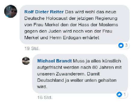Rolf Dieter Reiter: „Das wird wohl das neue Deutsche Holocaust der jetzigen Regierung von Frau Merkel den der Hass der Moslems gegen den Juden wird noch von der Frau Merkel und Herrn Erdogan erhärtet“ (7 Likes)