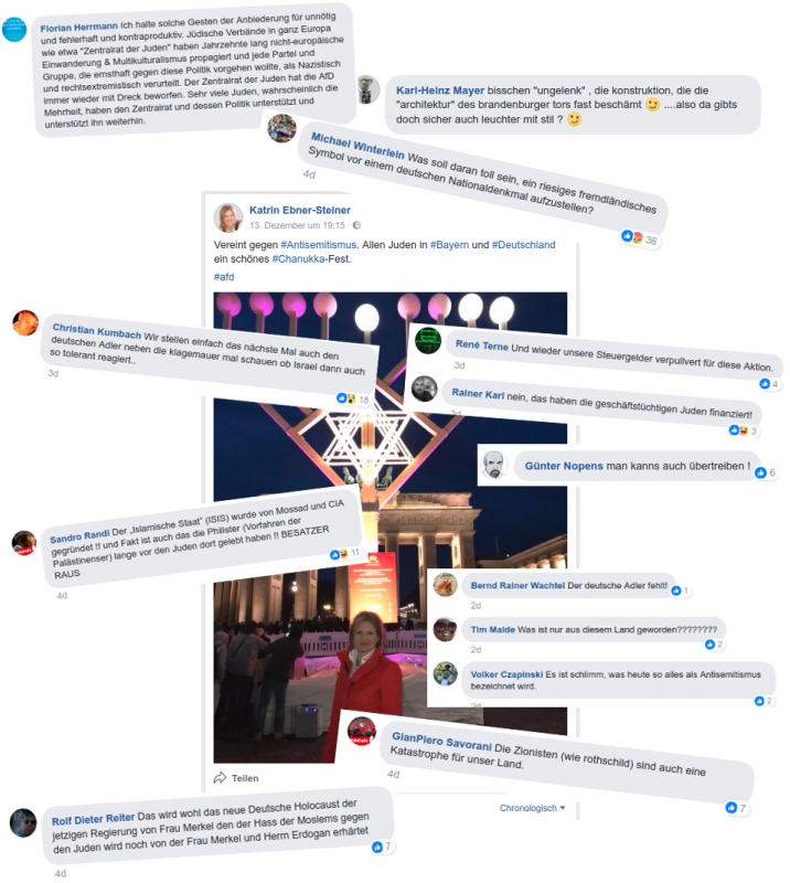 Als die Deggendorfer AfD Vorsitzende Katrin Ebner-Steiner am 13. Dezember ein Bild auf ihrer Facebookseite postete, auf dem sie in Berlin vor dem, anlässlich des Channukah Festes aufgebauten, Channukah Leuchters posiert, provoziert sie damit eine Welle antisemitischer Kommentare.