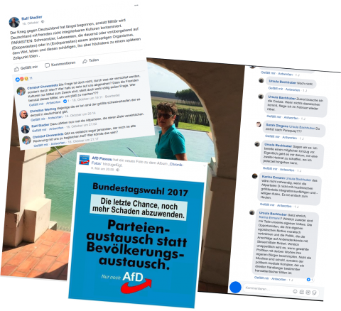 Die Palette des (modernen) Antisemitismus reicht letztlich von der als "Israel-Kritik" getarnten Judenfeindlichkeit über völkische Judenfeindlichkeit bis zur verkürzten oder versponnenen Globalisierungs- und Kapitalismuskritik. Viele dieser Mechanismen von Antisemitismus finden sich exemplarisch in den Kommentaren der AfD-Fans auf Katrin Ebner Steiners Facebookseite wieder (siehe Bild 1). Doch nicht nur die Parteifreund*innen, auch die lokalen Parteimitglieder und ihre Funktionär*innen bedienen sich nur zu gern antisemitischer Argumente.