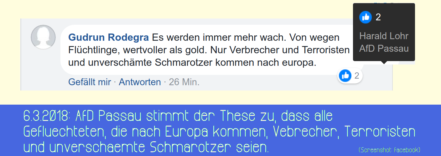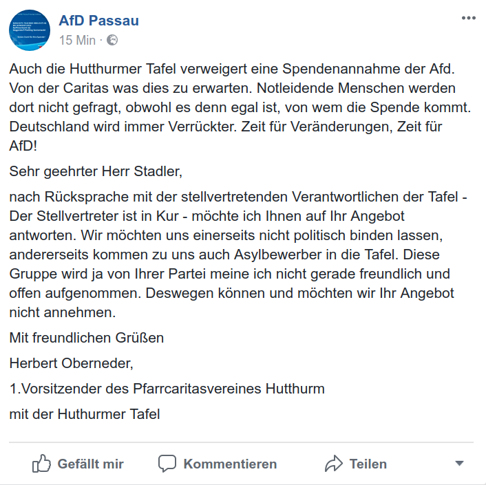 *Update* Am 06. März 2018 publizierte die AfD Passau außerdem auf ihrer Facebookseite, dass auch die Hutthurmer Tafel das Kooperationsangebot mit der AfD, mit Verweis auf deren rassistische Haltung, abgelehnt habe. Dabei lässt es sich die AfD Passau nicht nehmen, sich darüber zu empören, dass man ja lediglich notleidenden Menschen helfen wolle. Interessanter Weise hatte die AfD Passau erst am selben Tag auf ihrer Facebookseite Geflüchtete bzw. Asylbewerber*innen implizit als Terroristen, Verbrecher und Schmarotzer beschimpft [und den durch sie ,gelikten' rassistischen Kommentar nach Publikation dieses Artikels wieder gelöscht.]. Typisch AfD eben.