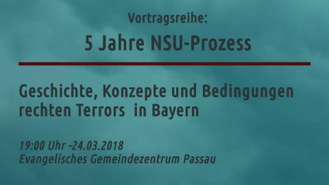 Der Prozess gegen die Hauptangeklagten des NSU, der seit nunmehr knapp 5 Jahren andauert, neigt sich seinem Ende zu. AnlĂ€sslich der bevorstehenden UrteilsverkĂŒndung veranstalten wir eine Vortragsreihe, die sich mit Rechtem Terror in Bayern, dem NSU(-Prozess) sowie dem alltĂ€glichen Rassismus auch von Seiten der Behörden auseinandersetzt. Die rassistischen ZustĂ€nde zu benennen, sie nicht in Vergessenheit geraten zu lassen und ihnen etwas entgegenzusetzen ist Ziel dieser Vortragsreihe.