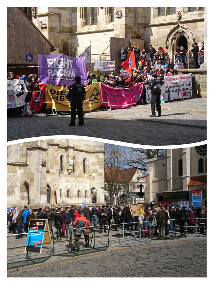 Den Auftakt machte eine AfD- Protest-Kundgebung gegen den seit 2016 geplanten Moscheebau in Regensburg (13:00 Uhr, Domplatz) mit der überregional bekannten Rassistin Katrin Ebner-Steiner. MdB Protschka und weitere AfD-Funktionäre. Anwesend waren unter den rund 200 AfD-Anhänger*innen auch die Junge Alternative Ostbayern als eigener „Block“. Dem gegenüber stand ein Protest von bis zu 400 Regensburger*innen, die die Rassist*innen in Grund und Boden buhten und skandierten.