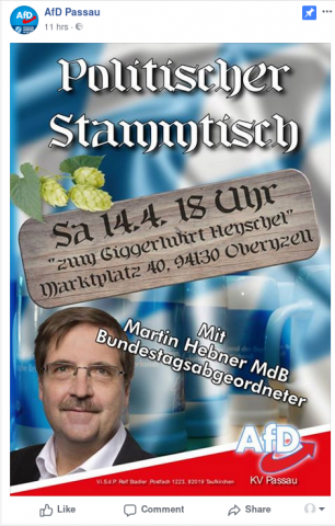Wann Samstag, 14.04.2018 - 18:00 Wo Giggerlwirt HENSCHEI, Obernzell +++ AfD will HEUTE eine Veranstaltung in Obernzell abhalten! +++ Ab 18 Uhr soll ein Stammtisch mit MdB Martin Hebner im "Giggerlwirt HENSCHEI" stattfinden. Kategorie AfD