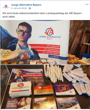 Die Junge Alternative Ostbayern scheint auch im Juni 2018, entgegen vollmundiger Ankündigungen zu Beginn des Jahres, eher von Inaktivität geprägt. So zeigten sie sich lediglich mit einem Infostand beim Landesparteitag der AfD in Nürnberg am 09.06.2018 und veranstalteten einen internen JA Stammtisch in Straubing am 24.06.2018. Der nicht publizierte Ort sollte nur bei Anmeldung unter ostbayern@ja-bayern.de bekannt gegeben werden.