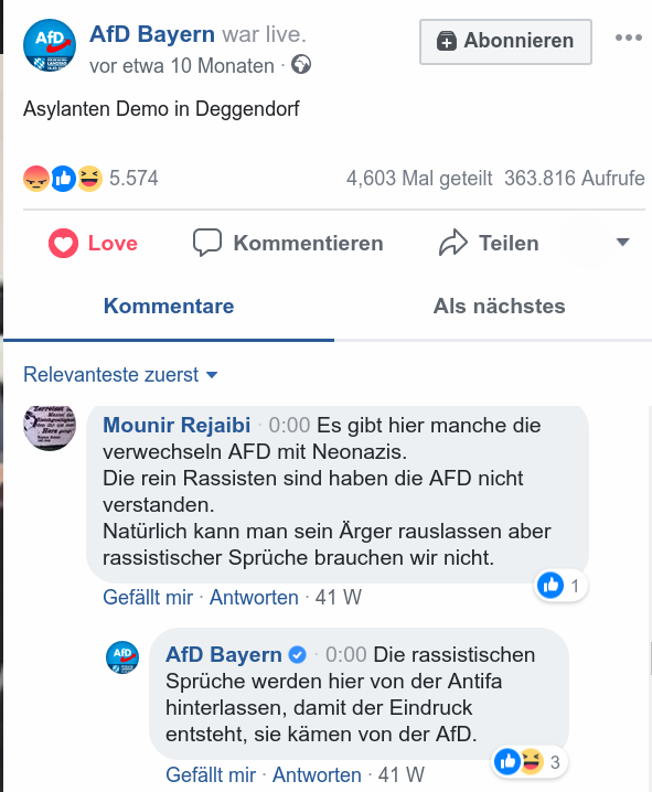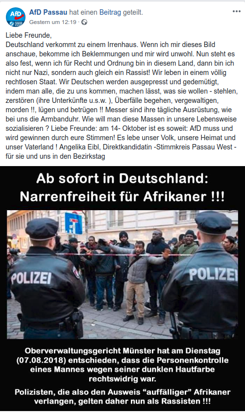 Im Dezember 2017 war es unter einem Facebook-Livestream der Deggendorfer AfD-Funktionärin Katrin Ebner-Steiner über eine Demonstration von Geflüchteten zu einer Flut an rassistischen Hasskommentaren gekommen. Die Staatsanwaltschaft hatte nach BR Informationen 266 Ermittlungsverfahren eingeleitet. Die AfD weißt jedoch jede Schuld von sich, vielmehr wähnt sich Ebner-Steiner als Opfer einer politischen Intrige, die rassistischen Postiongs stammten allesamt von 'der Antifa und seinen eine false-flag Aktion um die AfD zu diskreditieren.1314