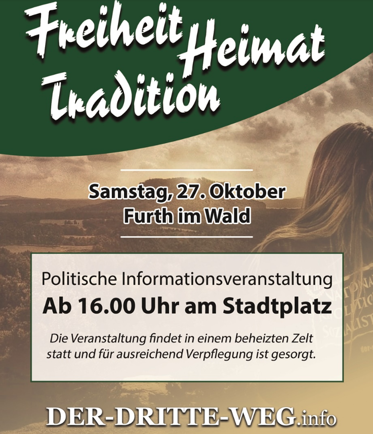 Die Neonazi-Partei "Der III. Weg" plante am Samstag den 27. Oktober 2018 in Furth im Wald (Landkreis Cham) einen "Informations- und Rednerabend" ab 18.00 Uhr im Gasthaus Jelinek. Nachdem das Gasthaus, welches sowohl die Aktivist*innen des III. Wegs als auch andere rechtsextreme Organisationen (Deutsche Konservative) 1 zuvor des öfteren beherbergt hatte, die Räume für den Abend aus unklaren Gründen kündigte, verlegten die Neonazis ihr Treffen auf den Stadtplatz in Fürth. Ab 16 Uhr sollte die Parteivorstellung in einem geräumigen, beheizten Zelt stattfinden. Begleitet von lautstarken Protesten von rund 250 Gegendemonstrant*innen fand sich neben den Aktivist*innen des Stützpunkts Ostbayern am Samstagnachmittag auf dem Stadtplatz eine überschaubare Gruppe von Anhängern (darunter Ewald Ehrl von der Deutschen Konservativen) im Versammlungszelt ein. 2