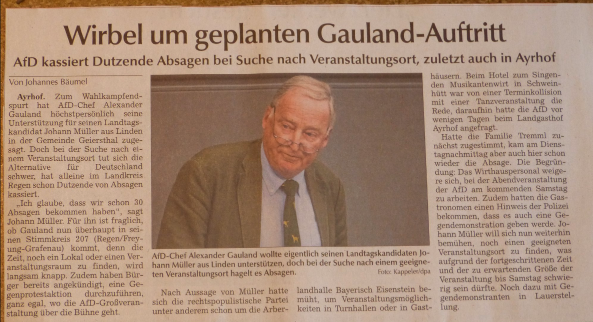 Nach vergeblicher Raumsuche und angekündigtem Gegenprotest sagte die AfD ihre geplanten Veranstaltungen mit Bundesvorsitzendem Alexander Gauland ersatzlos ab. Nachdem die Partei rund 30 Raumabsagen erhalten hatte, nannte Katrin Ebner-Steiner als Grund für die Absage Sicherheitsbedenken und wähnte eine Intrige durch ihre Gegner von „Antifa bis CSU“. Geplant waren mehrere Veranstaltungen in Regen, Plattling und Deggendorf. Erneut zeigt sich, dass konsequente Aufklärungsarbeit bei Wirt*innen und antifaschistischer Protest wirken!1718