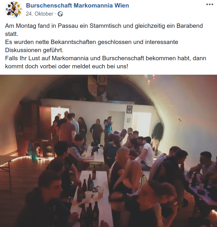 m 22.10 veranstaltete die Burschenschaft Markomannia einen Barabend und Stammtisch in den burschenschaftseigenen Räumlichkeiten in der Passauer Altstadt (Steinigergasse 10). Nach Angaben der Burschenschaft war die Veranstaltung gut besucht.3