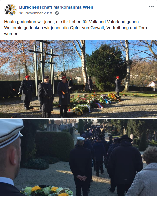 Kontrovers zu betrachten sind hingegen die städtischen Trauerfeiern zum jährlichen Volkstrauertag (heuer 18.11). Anlässlich derer wird traditionell an diversen Kriegs- und Soldatendenkmälern vor allem den Gefallenen der Weltkriege bzw. der deutschen Kriegsopfer und Militärangehörigen gedacht. Dieses Gedenken, welches auch das Gedenken an gefallene Soldaten der Wehrmacht impliziert, hinterlässt nicht nur aus Perspektive der Gedenkkultur und des Geschichtsrevisionismus einen bitteren Beigeschmack. Die Gedenkfeiern zum Volkstrauertag locken vor allem auch regelmäßig Neonazis und Vertreter*innen neonazistisch und/oder rechtsextrem ausgerichteter Organisationen und Parteien zu den öffentlichen Feiern auf dem Passauer Innstadtfriedhof. In Passau stehen diese, beispielsweise als lokale NPD-Funktionäre, Aktivist*innen der Neonazipartei Der III. Weg (so geschehen in den Jahren 2014-2016) und in diesem Jahr in Form lokaler Verbindungsmitglieder der rechtsextremen Burschenschaft Markomannia Wien, klar erkenntlich uniformiert, Schulter an Schulter mit lokaler Politprominenz, Angehörigen des Verbands der Reservisten der Deutschen Bundeswehr und Angehörigen von Rettungskräften (Feuerwehr, Malteser usw.). Sie beteiligten sich auch aktiv durch das Niederlegen eigener Kränze an den Denkmälern. Dabei dürften Organisationen wie der, sich für den historischen Nationalsozialismus begeisternde, Dritte Weg oder die Burschenschafter der Markomannia Wien zu Deggendorf vielmehr ihre prominenten Idole und Bundesbrüder ehren, und deutscher Täter, anstelle der (im offiziellen Titel der Veranstaltung genannten) „Opfern der beiden Weltkriege und der nationalsozialistischen Gewaltherrschaft“ gedenken. Die Neonazipartei (Der III. Weg) legt in Passau traditionell einen Ehrenkranz für den Hitler-Stellvertreter Rudolf Hess nieder. Zu den bekanntesten Verbindungsmitgliedern der Markomannia Wien gehörten u.a. Otto Koller (Arzt im Rang eines SS-Hauptsturmführers, 1917–2015) und Otto Skorzeny (SS-Obersturmbannführer, 1908–1975). Dass die Stadt Passau diese Machtdemonstration der Rechten unwidersprochen zulässt und deren NS-Tätergedenken und geschichtsrevisionistische Auftritte durch Untätigkeit legitimiert, macht die ständige Mahnung des 9.11 zur Farce.