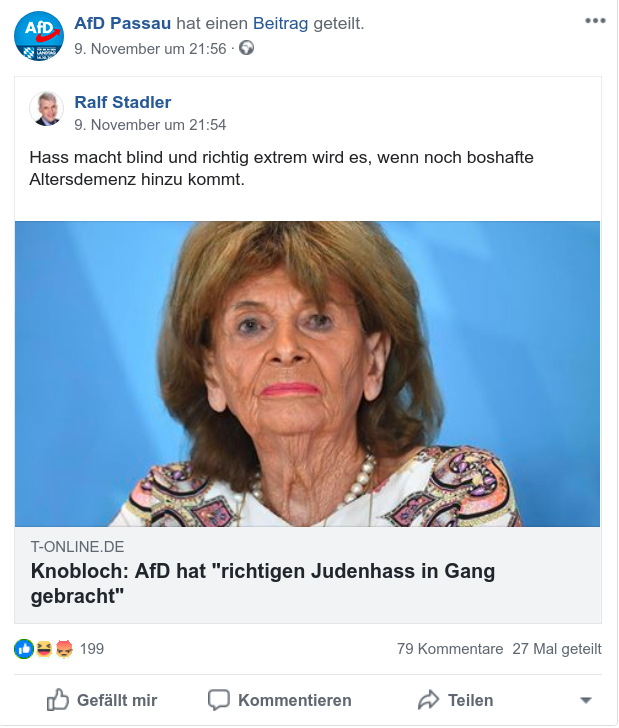 Ob Stadler aus Gründen der Provokation, im Sinne der üblichen rechten Raumergreifungsstrategie oder zum Aufpolieren seines durch die Verfassungsschutzbeobachtung ramponierten Images teil nahm - eine Sensibilisierung schien dadurch bei dem, für antisemitische Ressentiments anschlussfähigen, Rechtsextremisten nicht einzutreten. Stadler ließ es sich jedenfalls nicht nehmen, am Abend des 9.11 einen Beitrag auf seiner Facebookseite zu teilen, in dem er die Repräsentantin jüdischen Lebens in Deutschland, Charlotte Knobloch als „vor Hass blind“ und „boßhaft altersdement“ beleidigt und verunglimpft. Diese hatte einem verlinkten t-online-Bericht zufolge den durch die AfD befeuerten Judenhass kritisiert. Diesen Vorwurf Knoblochs und die Aufrufe des 9.11-Gedenkens, nicht gegen gesellschaftliche Gruppen, Juden und Jüdinnen angesichts im Speziellen, zu hetzen, nimmt Stadler zum Anlass um wieder einmal den Hass seiner Fans auf eine Repräsentantin der Juden und Jüdinnen in Deutschland zu entfesseln. Diese reagieren wie gewohnt empört uns sparen nicht an sexistischen und beleidigenden Kommentaren gegenüber Knobloch.