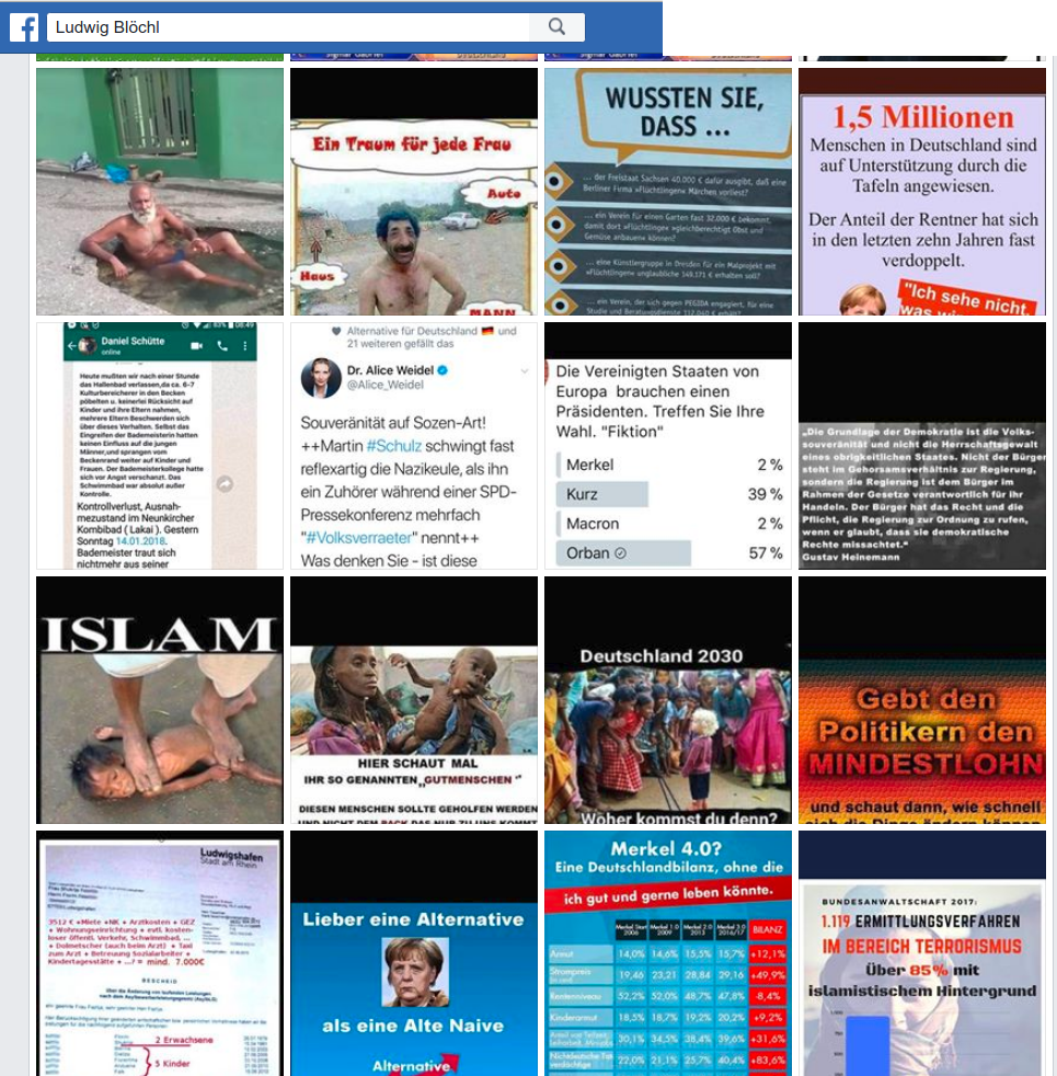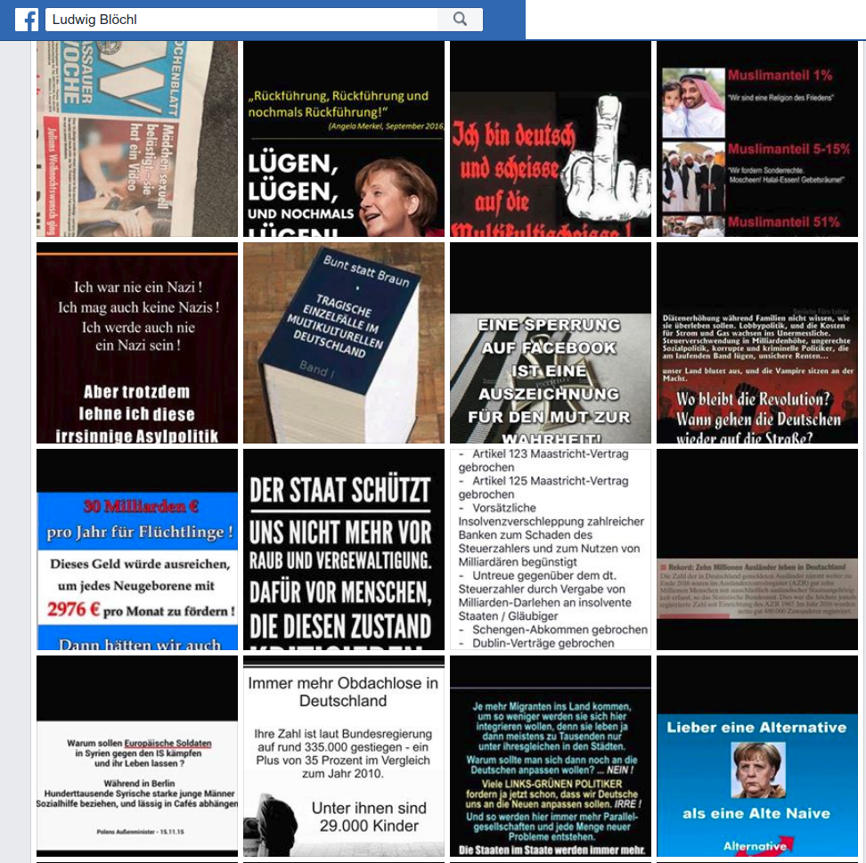 Ludwig Blöchl lebt im Landkreis Freyung-Grafenau und war vor allem auf Twitter und Facebook aktiv. In der Vergangenheit nahm er jedoch auch schon an AfD-Veranstaltungen und Infoständen teil. Wagt man einen Blick auf die diversen Social-Media Accounts von Blöchl, wird man konfrontiert mit einer fast schon absurd großen Menge an Posts und Retweets. Thematisch zeichnen sie das Bild eines zutiefst rassistischen, antimodernen und verschwörungstheoretischen Rechtsextremen. Insbesondere die Diesel-Fahrverbote, aber auch Verschwörungstheorien zum angeblich geplanten Austausch des deutschen Volkes und fanatischer Hass auf den Islam haben es Blöchl angetan.