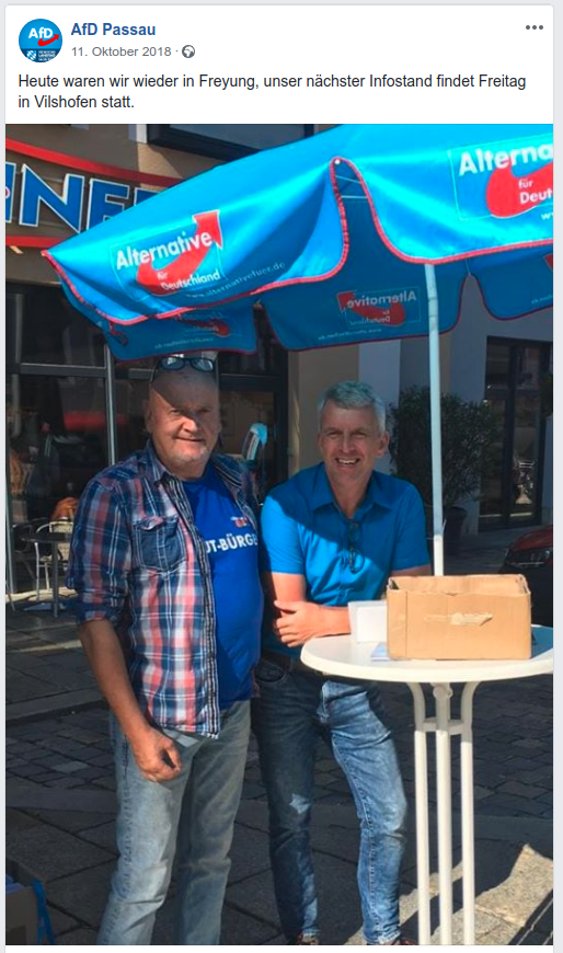Der AfD Kreisverband Passau/Freyung-Grafenau hat einen neuen Vorstand gewählt. Öffentlich bekanntgegeben wurde die Änderung nicht, lediglich auf der neuen Website des AfD-Kreisverbands (www.afd-passau-freyung-grafenau.de) findet sich eine aktualisierte Vorstandsübersicht (Stand: 01.02.2019). Erneut öffnet sich die, ohnehin bereits extrem rechts zu verortende AfD Passau, damit weiter nach rechts, mit dabei jetzt auch offizielle Kontakte zu PEGIDA sowie weitere Sympathien für die „Identitäre Bewegung“. Auffallend ist auch, wie für die AfD üblich, dass der Vorstand aus 7 Männern und lediglich einer Frau besteht.1Der Passauer AfD-Kreisverband war die ersten Jahre unter weiblicher Führung, die in Ungnade gefallenen Vorsitzenden Elke Brunner und Ursula Bachhuber (beide Vilshofen) wurden jedoch im Dezember 2017 abgewählt und vertraten die AfD fortan im Bezirksvorstand Niederbayern.