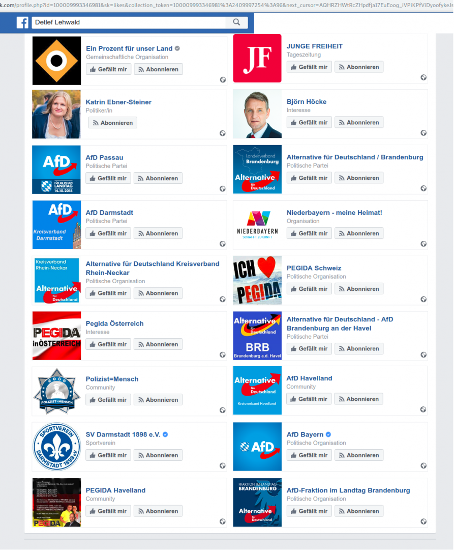 Auch auf seinem Facebook-Account zeigt Lehwald deutliche Affinitäten zum extrem rechten Teil der AfD sowie zu anderen, ihm vermutlich teilweise auch im Kontext der Demos persönlich bekannten, Akteuren und Strukturen der rechtsextremen und neonazistischen Szene auf. (Siehe Screenshot in der Galerie).