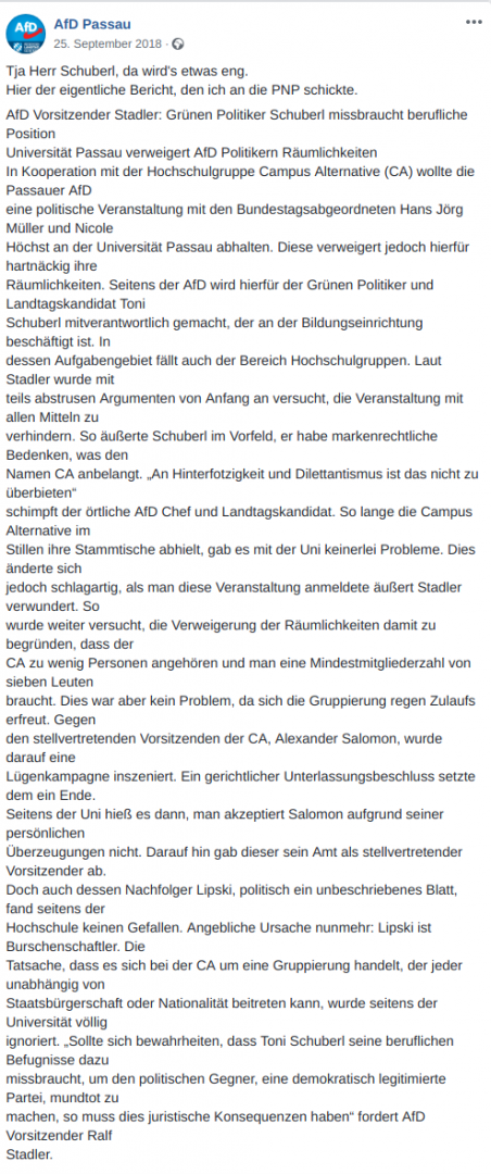 Der Versuch, die Campus Alternative (CA) als Hochschulgruppe in Passau zu etablieren, ging maßgeblich von Burschenschaftlern der Markomannia aus. Laut einer Darstellung der AfD Passau auf Facebook war zuerst Alexander Salomon und später Tobias Lipski stellvertretender Vorsitzender der CA Passau.5 Vorsitzender der Hochschulgruppe war dagegen Andreas Meißner, der noch bis 2016 Vorstandsmitglied der JA Bayern war,6 und dessen rassistische und holocaustrelativierende Postings auf Facebook dazu führten, dass der Campus Alternative 2018 ihre Akkreditierung als Hochschulgruppe entzogen wurde.7