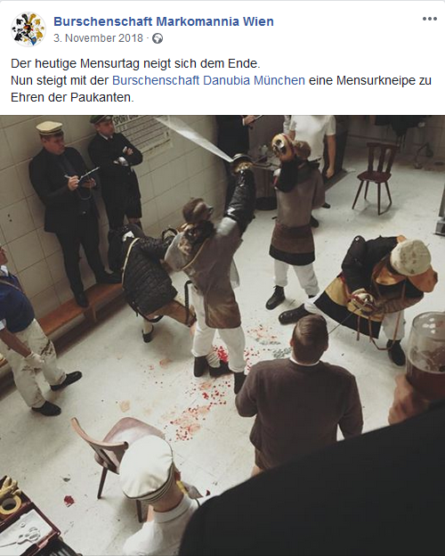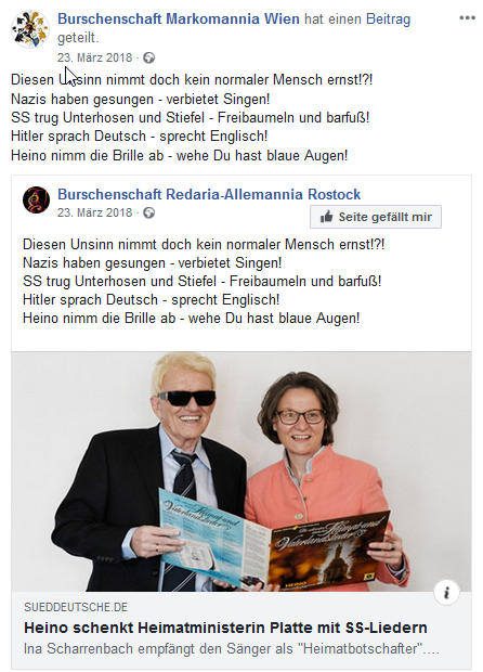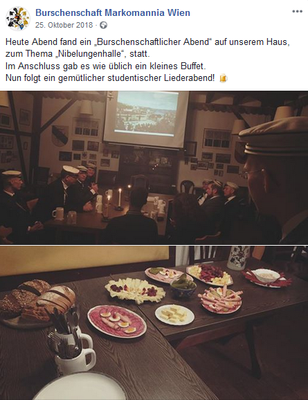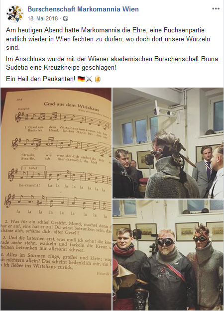 Die Nähe der Deutschen Burschenschaft zu NeofaschistInnen zeigt sich deutlich in ihrem Verbandsorgan, den „Burschenschaftlichen Blättern“, dort wird dem Who-is-Who der extremen Rechten Raum für ihre Publikationen geben, von NPD-Kadern wie Arne Schimmer bis hin zur neofaschistischen italienischen „Casa Pound“.16 Ergänzt wird das „Bildungsangebot“ der „Burschenschaftlichen Blätter“ noch durch Schulungen und Seminare zu rechtsextremen Themen. Die Nähe zum Nationalsozialismus, die die völkischen Burschenschaften aufweisen, bleibt jedoch nicht auf der Ebene der theoretischen Auseinandersetzung, sondern findet sich auch im Liedgut der Burschenschaften wieder. 2015 postete die Markomannia eine Zeile des SS-Treueliedes auf Facebook und auch die persönliche Youtube-Playlist des Markomannen Alexander Salomon besteht fast ausschließlich aus nationalsozialistischen Liedern der SA.17Damit ist die Burschenschaft Markomannia Wien jedoch kein Einzelfall, erst vor Kurzem erschütterte der Liederbuch-Skandal Österreich. Bei der pennalen Burschenschaft Germania zur Wiener Neustadt wurde beispielsweise ein Liederbuch mit der Zeile „Gebt Gas, ihr alten Germanen, wir schaffen die siebte Million“ gefunden.18 Auch bei der Burschenschaft Bruna-Sudetia, bei der die Markomannen erst jüngst zu Gast waren,19 wurde bei einer Hausdurchsuchung ein antisemitisches Liederbuch beschlagnahmt.20 Neben der Bruna-Sudetia pflegten die Markomannen im letzten Jahr auch sonst gute Kontakte zum Who-is-Who der rechtsextremen Burschenschaften. Beispielsweise waren die Passauer Burschenschaftler am 24. März 2018 zu Gast bei der Germania Ried,21 gegen die jüngst Ermittlungen liefen, weil dort 2017 ein Konzert mit der Neo-Nazi-Band Fylgien veranstaltet wurde.22