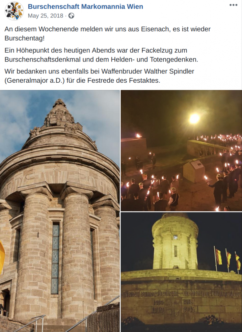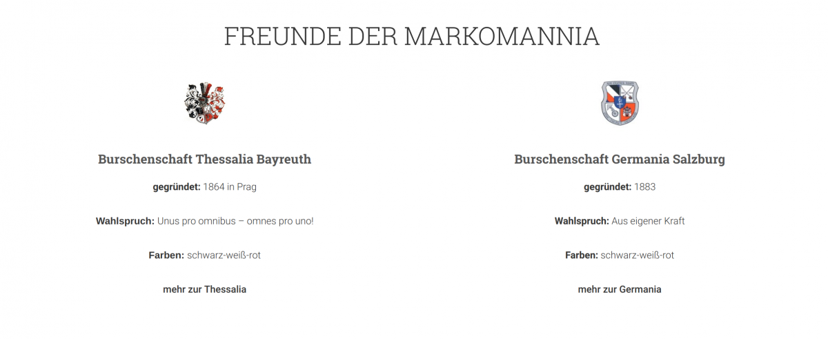 Die offizielle Freundschaft zur Thessalia Prag zu Bayreuth ist ebenfalls nicht zu verachten. Im Herbst 2014 wurde bekannt, dass Mario Brehme, enge Bezugsperson des NSU-Kerntrios und Teil des neonazistischen Thüringer Heimatschutz, im Haus der Thessalia wohnte. Auch der Neonazi Jürgen Schwab war bis 2002 Mitglied in der extrem rechten Bayreuther Burschenschaft.23Zur vom Verfassungsschutz beobachteten und mit Neonazismus in Verbindung gebrachten Danubia München bestehen gute Kontakte, wie sich auf Social Media verfolgen lässt, erst am 3. November 2018 waren die Markomannen für eine Mensur bei den Danuben in München zu Gast.24