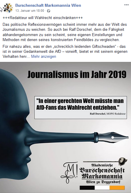 Insbesondere in Österreich besitzt die DB großen Einfluss, ein großer Teil der männlichen FPÖ-Politiker ist Mitglied in einer der DB-Burschenschaften, doch auch in Deutschland mehrte sich der Einfluss und der Zugang zu Machtpositionen mit dem Aufstieg der AfD.12 Die diversen rechtsextremen Skandale und Überschneidungen mit der neonazistischen Rechten gingen an den Burschenschaften dabei meist ohne ernste Konsequenzen vorbei. Die 2011 geführte Diskussion um einen „Ariernachweis“ sorgte beispielsweise weniger für eine gesellschaftliche Isolation als vielmehr für eine Radikalisierung der DB. Die Markomannia war trotz ihrer formalen Inaktivität nicht nur Mitglied in der Deutschen Burschenschaft, sondern durchaus auch aktiv, beispielsweise wurden regelmäßig deren Verbandstreffen besucht.13 Mit Sven Beckendorf war 2005 ein Markomanne gewählter Ansprechpartner der Deutschen Burschenschaft im Ressort „Politik und Kultur“.14 Beckendorf pflegt, nach diversen Überschneidungen und Likes auf Facebook zu schließen, noch immer guten Kontakt zur Markomannia.15