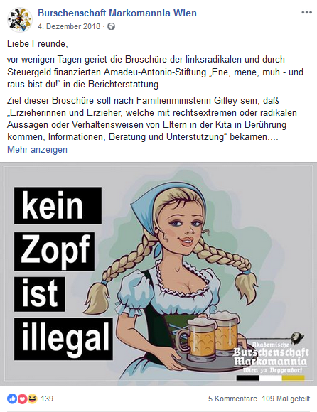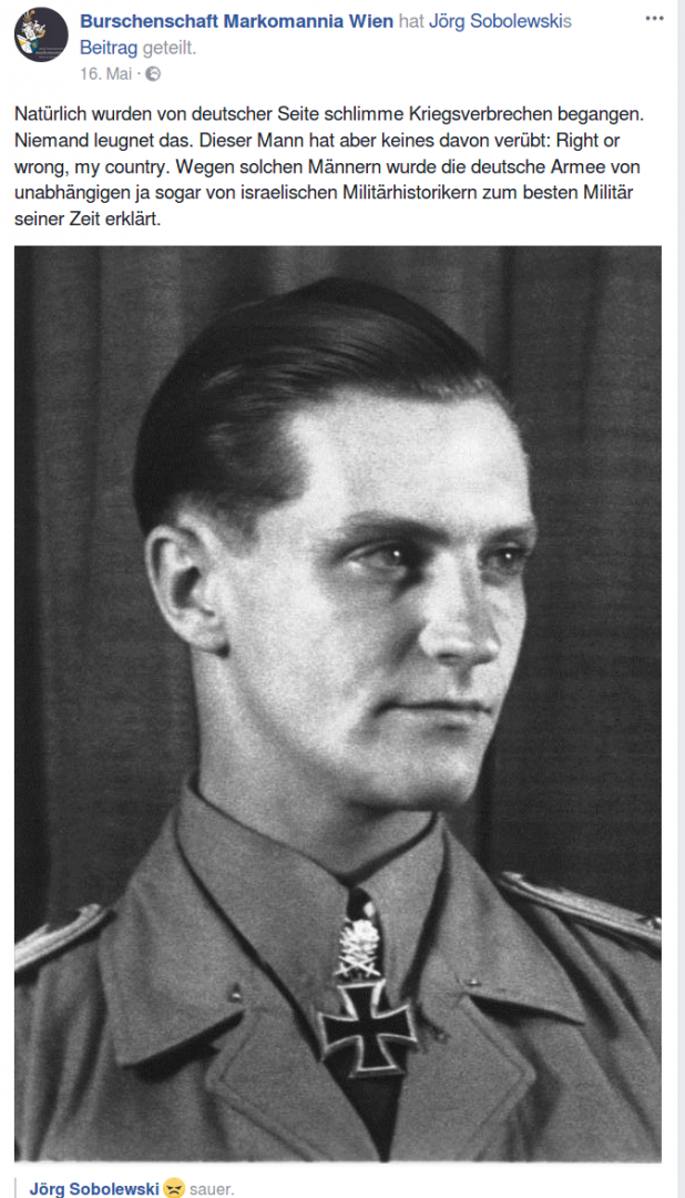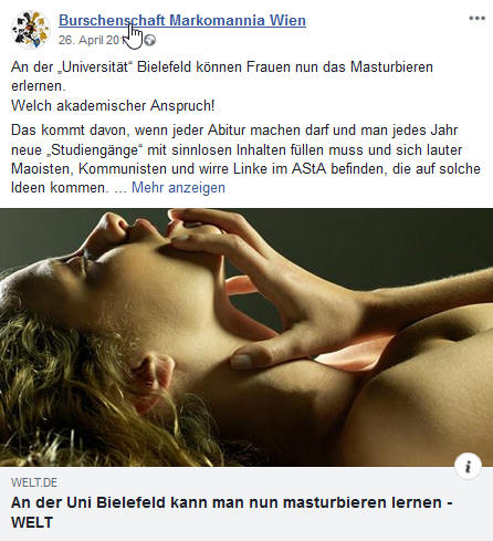 Im Folgenden soll in aller Kürze auf die ideologische Verortung und die politischen Aktivitäten der Markomannia Wien eingegangen werden. Wie alle Burschenschaften seit der Jenaer Urburschenschaft von 1815 versteht sich auch die Markomannia als explizit politischer Studentenbund. Die konkrete Ausformung dieses politischen Anspruchs kann dabei von liberal über konservativ bis extrem rechts reichen, bei der Markomannia ist letzteres der Fall. Auch die Deutsche Burschenschaft und insbesondere die Burschenschaftliche Gemeinschaft, zu deren Mitgliedern die Markomannia gehört, ist konsequent völkisch und deutsch-nationalistisch eingestellt. Beispiele dafür finden sich auch in den Öffentlichkeitsauftritten der Markomannia. Eine Abgrenzung zum historischen Nationalsozialismus findet dabei kaum bis gar nicht statt, offen wird nationalsozialistischen Militärs wie beispielsweise Hans-Joachim Marseill33 gedacht. Weiter sind Männerbund und die autoritäre Erziehung zur künftigen Elite elementare Bestandteile burschenschaftlicher Identität und Selbstwahrnehmung. Auffallend ist zudem, dass die Ablehnung einer als links und liberal wahrgenommenen Mehrheitsgesellschaft identitätsstiftendes Moment zu sein scheint. Auf Facebook wird dies deutlich, wenn, ganz im Stile neu-rechter Metapolitik, versucht wird, eine feministische und linke Hegemonie zu konstruieren und diese dann durch Entkontextualisierung und vermeintliche Satire ad absurdum zu führen.34