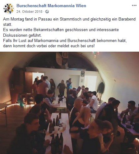 Mit Michael Gallerman ist auch ein Aktivist der neofaschistischen Identitären Bewegung Teil der Markomannia. Demzufolge verwundert es auch nicht, dass das Gründungstreffen der Identitären Bewegung Niederbayern 2016 im Haus der Markomannia in Deggendorf stattfinden konnte.32 Kontakte zur Identitären Bewegung bestehen aber nicht nur über Michael Gallermann, sondern auch über die Burschenschaftliche Gemeinschaft. Beispielsweise ist die extrem rechte Burschenschaft Olympia Wien, in der auch diverse IB-Kader, darunter zeitweise Martin Sellner, korporiert sind, Mitglied der BG.