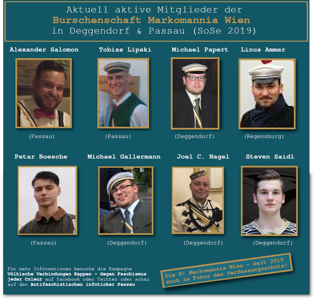 Mit der Burschenschaft Markomannia Wien zu Deggendorf macht sich seit einiger Zeit eine extrem rechte Studentenverbindung in der Passauer Altstadt breit. Im Folgenden sollen die diversen Verstrickungen der Markomannia in das rechte und neonazistische Milieu aufgezeigt und eine kurze Einordnung ihrer Ideologie und politischen Aktivitäten gegeben werden. Auf sämtliche Punkte wird in einem ausführlichen Reader über die