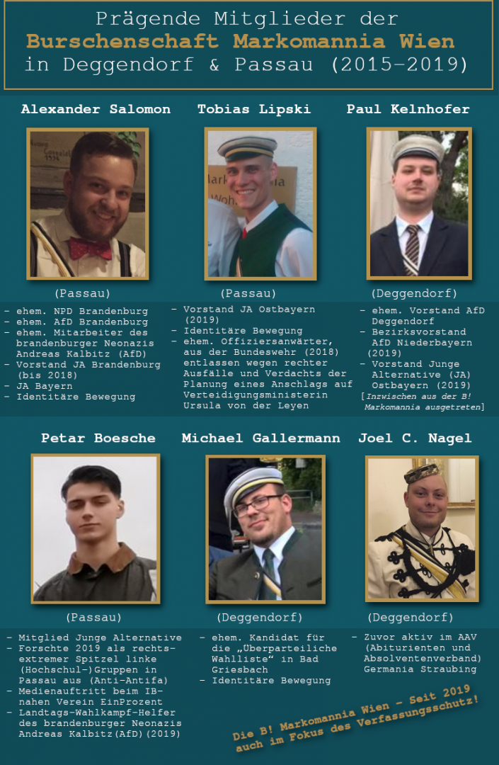 (Für eine genauere Auseinandersetzung mit der Markomannia, ihren Mitgliedern, Zielen und Verbindungen empfehlen wir folgenden Link zur weiterführenden Lektüre: https://www.infoticker-passau.org/sites/default/files/MarkoReader_Auflage1_April2019.pdf)