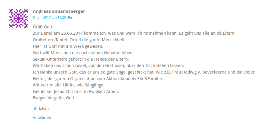 Antifeminismus fungiert als ideologische Schnittstelle zwischen Konservativen und der extremen Rechten. Dementsprechend ist es auch nicht verwunderlich, dass es immer wieder zu antifeministisch-konsverativen bis extrem rechten Schulterschlüssen kommt. Ausdruck dessen waren zum Beispiel die „Demo für alle“, an der am 25.06.2017 in Wiesbaden, laut eigener Aussage, auch Eimannsberger anwesend war14.