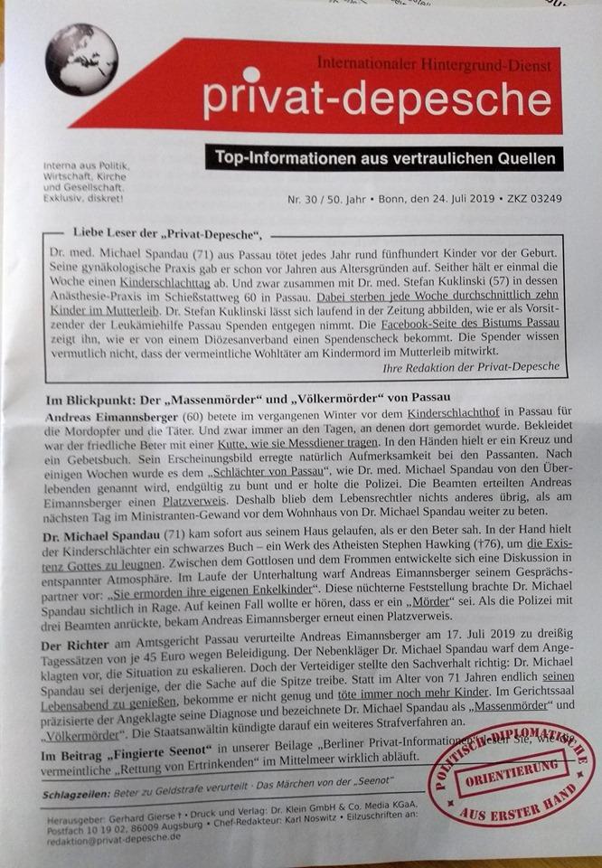 In der Person Eimannsberger verbinden sich die kroatische Rechte, die selbsternannte „Lebensschutzbewegung“, die AfD und verschwörungstheoretisches Reichsbürgertum. Als zentrales ideologisch verbindendes Element tritt vor allem Antifeminismus und das Absprechen von einer sexuellen und körperlichen Selbstbestimmungsrecht von Frauen* auf. Die engen Verknüpfung einer solchen Ideologie mit Rassismus und Antisemitismus werden durch Eimannsberger sehr deutlich. Eimannsberger ist somit kein harmloser vereinzelter christlicher Fundamentalist, sondern Ausdruck einer transnationalen Schnittstelle zwischen verschiedenen christlichen und gewaltbereiten extrem rechten Kräften. Seine strafrechtliche Verurteilung wegen Beleidigungen gegen Dr. Spandau, der einzige Arzt der in Passau Schwangerschaftsabbrüche durchführt, zeigt außerdem, dass er zusätzlich zu der Drangsalierung von Schwangeren durch Schilder und Flyer durchaus bereit dazu ist, Menschen auch aktiv zu bedrängen. Auch im Gerichtsaal konnte Eimannsberger sich nicht zurück halten, dort bezeichnete er Dr. Spandau wohl als „Massenmörder“ „Völkermörder“, weswegen offenbar aktuell ein weiteres Verfahren gegen Eimannsberger läuft.