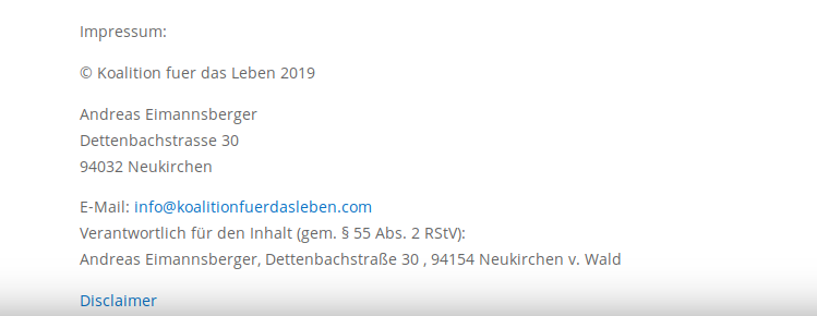 Im gleichen Kommentar zitiert Eimannsberger einen Flyer mit der an Auschwitz angelehnten Inschrift „Abtreibung macht frei“, welcher von der Seite kindermord.org unter dem Vorsitz von Karl Noswitz veröffentlicht wurde. Noswitz ist außerdem Betreiber der christlich fundamentalistischen Website www.privat-depesche.de, welche über die Verurteilung Eimannsberger berichtet hatte [siehe Bild in der angehängten Bildergalerie]. Eimannsberger folgt Noswitz auch auf YouTube.16 Im Kommentar zitiert Eimannsberger den Flyer: