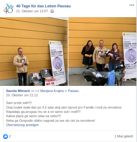 Die aus den USA stammende Initiative „40 Tage für das Leben“ verbreitet sich mittlerweile auch in Deutschland. Nach München, Frankfurt und Pforzheim fand diesen Herbst zum ersten mal auch eine Mahnwache in Passau statt. Initiiert wurde diese Bewegung in München durch Boris D., verurteilter Straftäter, ehemaliger Fußball-Hooligan und Funktionär der kroatisch faschistischen Partei HCSP., welche u.a. Neonazi Konzerte organisiert, sowie der „nationalen Koordinatorin“für Deutschland Sanela M.234