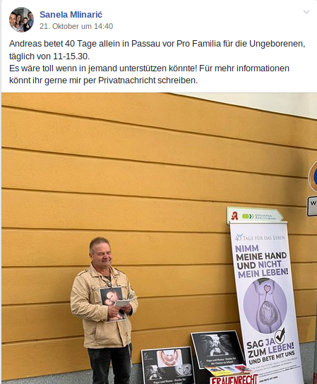 Seit dem 25.9.19 bis zum 3.11.19 (40 Tage) belästigt der, wegen Beleidigung zu 30 Tagessätzen a 45€ einschlägig verurteilte (ein weiteres Verfahren läuft aktuell noch gegen ihn)1 AfD-Kreistagskandidat und christliche Fundamentalist, Andreas Eimannsberger aus Waldkirchen, in Form einer Dauermahnwache Klient*innen auf ihren Weg zur Passauer Schwangerschaftskonflikts- und Familienberatungsstelle Pro Familia. Die meiste Zeit steht Eimannsberger mit seinen Schildern und Flyern alleine vor Pro Familia, ab und an bekommt dieser aber auch Gesellschaft z. B. vom extrem rechten Passauer AfD-Landtagsabgeordneten Ralf Stadler oder der, mit dem gewalttätigen faschistischen, kroatischen Flügel in Verbindungen stehenden, Sanela M. aus München. Die Mahnwache ist Teil der Initiative „40 Tage für das Leben“ bei der weltweit vor Kliniken und Beratungsstellen vierzig Tage lang antifeministische Propaganda gegen das Recht auf Schwangerschaftsabbruch betrieben wird.