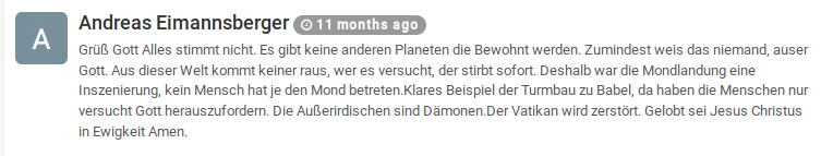 Auf Youtube folgt Eimannsberger außerdem verschiedenen verschwörungstheoretischen Kanälen (neben mehreren AfD Kanälen) unter anderem dem rechten Magazin „Compact“, welches antisemitische aufgeladene Verschwörungstheorien verbreitet.18 In Kommentaren unter solchen Videos wird deutlich, dass er die Mondlandung für eine Inszenierung hält, an verschwörungstheoretische Videos glaubt, die vor der angeblichen Gefahr vor Impfungen warnen oder in reichsbürgerischer Manier das Personalausweisgesetz für ungültig erklären. Ein Beispiel dafür wäre das Video des Reichsbürger Werner May.19 Eimannsberger selbst schreibt in einem Kommentar darunter „die mehrheit der der Deutschen glauben nicht an Gott, die mehrheit der Deutschen beten nicht mehr, wo ist das Hl.Römische Reich Deutscher Nation hingekommen?" [Fehler im Original].20