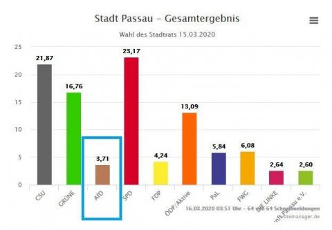 Die AfD erhielt mit 29.622 gültigen Stimmen [Achtung, Mehrfachstimmen pro Wähler!] ein Ergebnis von 3,71% und somit ein Mandat für zwei Stadträte (Robert Schregle, vom VS beobachteter niederbayerischer AfD-Bezirksrat und Kurt Haimerl, ehem. Passauer Stadtrat für die extrem rechte Partei „Die Republikaner“).